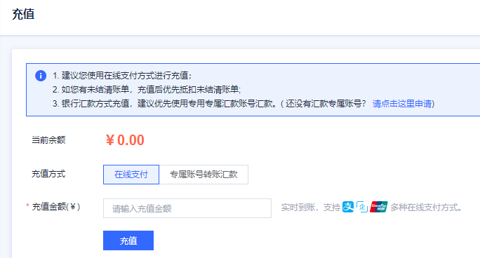 A:渠道伙伴可以按照实际需求为华夏云网账户充值,支持在线支付和专属账号转账汇款两种方式。