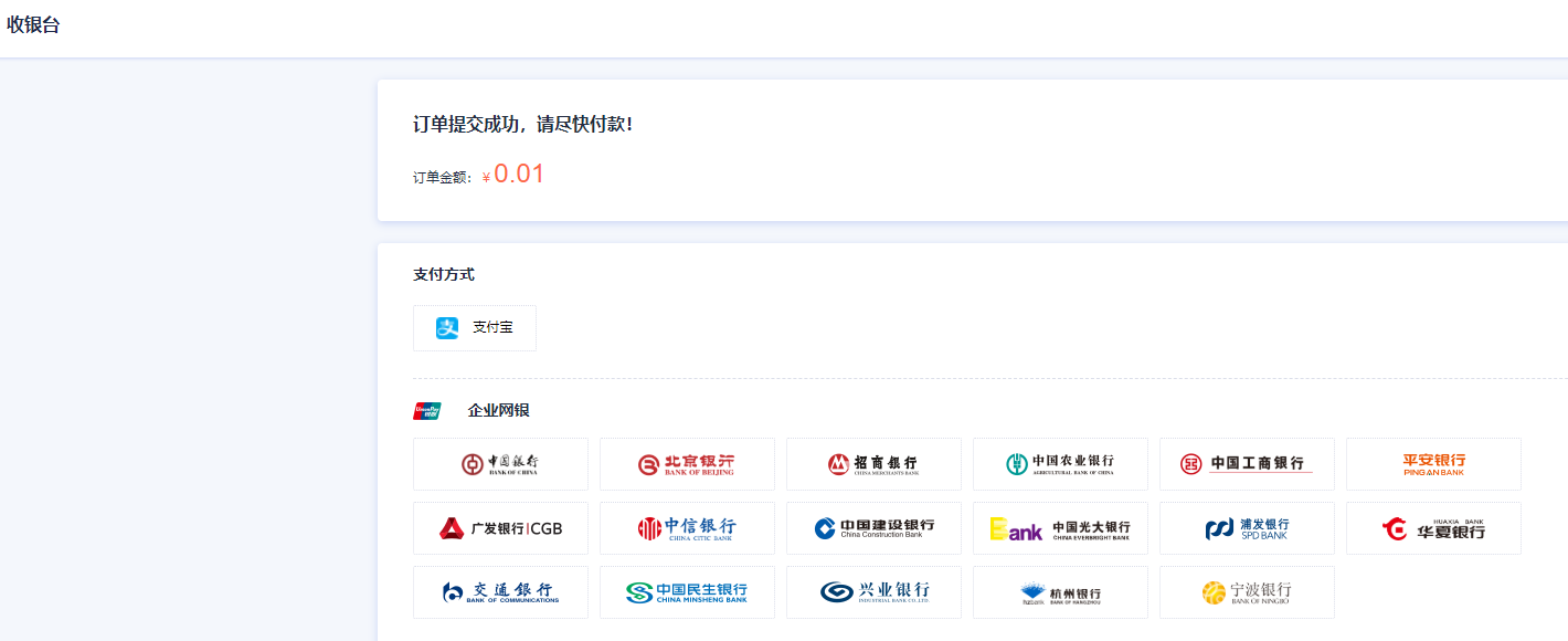 - 5、在收银台页面,选择付款方式,跳转至付款页面进行付款。
