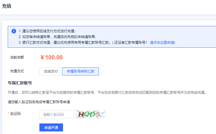 5、输入验证码,单击“申请开通”,申请开通专属汇款账号。