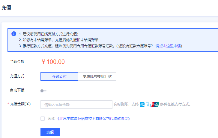 ②首次充值时,需阅读并勾选“阅读《北京中软国际信息技术有限公司代收款协议》”。