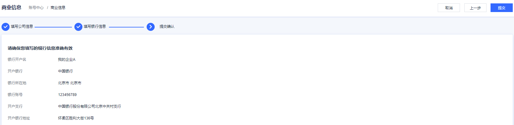 6、检查并确认填写的银行信息准确有效,单击“提交”,系统会提示“商业信息保存成功”。