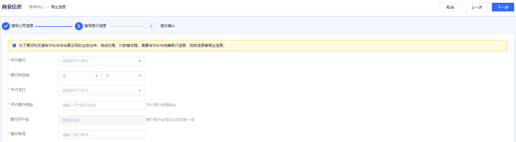 A:对渠道伙伴提出商业信息认证要求是为了更好地支撑伙伴与华夏云网业务往来,完成交易、付款等流程,伙伴需要完善银行信息、税务信息等商业信息。