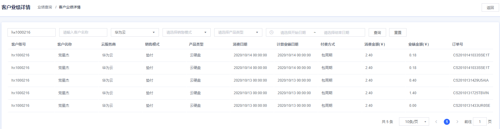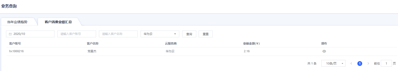 3、左侧“渠道中心”导航栏点击“业绩与激励”-“业绩查询”,点击“客户消费业绩汇总”页签,渠道伙伴可以查看名下客户的消费业绩汇总信息;
