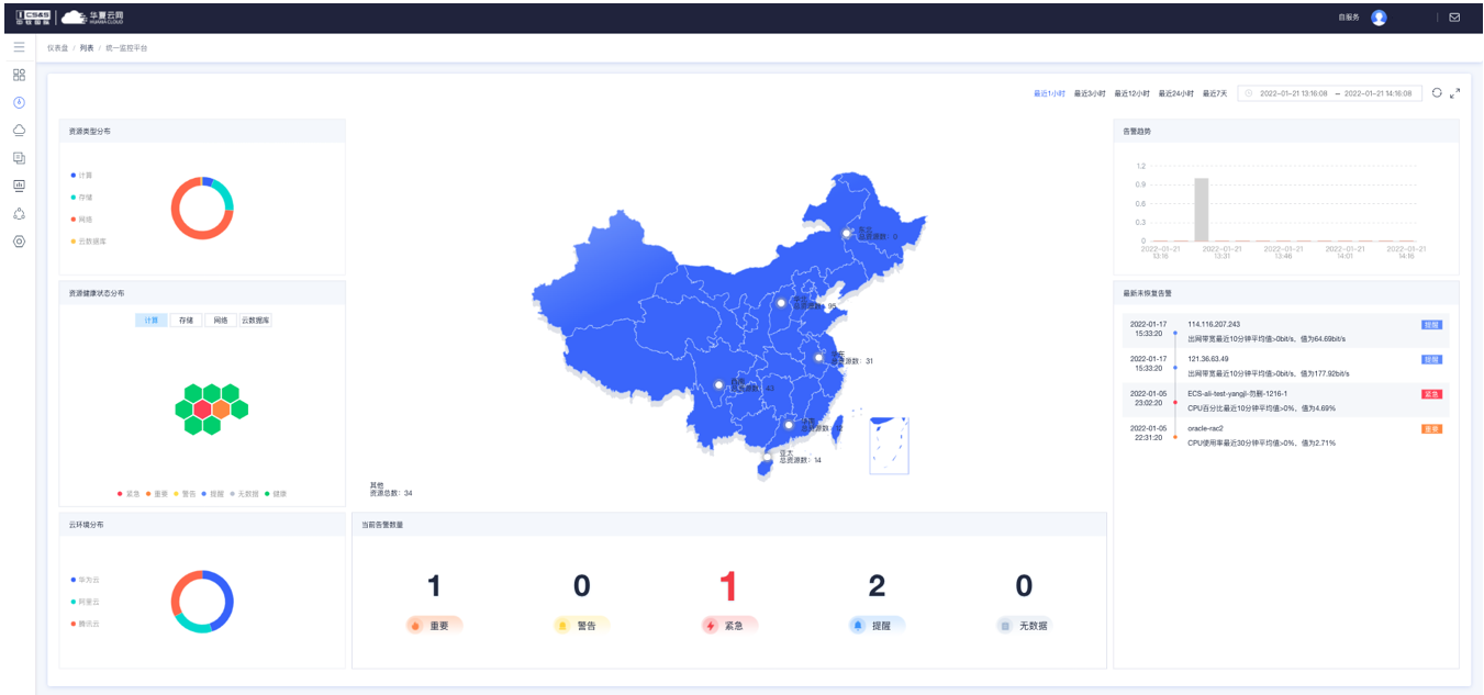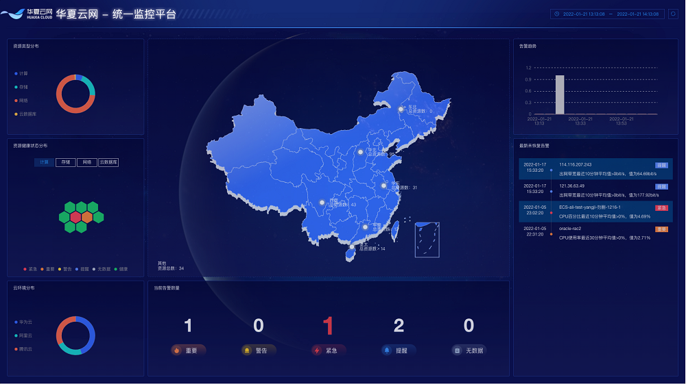 华夏云网云管仪表盘“统一监控平台”,可以直观展现IT基础架构和告警的整体健康状况。企业运维人员通过“统一监控平台”,可快速了解各云服务的资源使用情况和告警情况,完成多云的基础设施实时监控,快速洞察故障和风险,实现故障溯源,从而提高IT系统运维工作的整体效率及服务水平,保障业务系统的持续稳定运行。