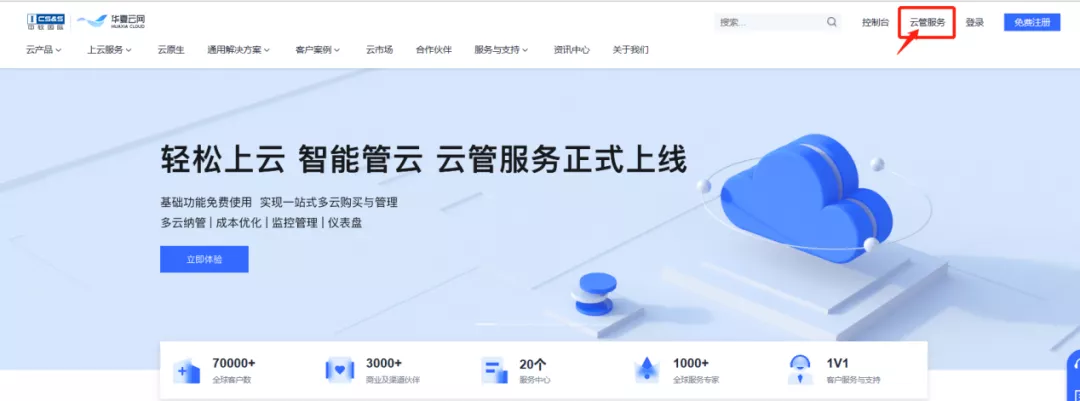 进入华夏云网(www.huaxiacloud.com)登录并完成实名认证,点击华夏云网首页右上角“云管服务”进入华夏云网云管服务页面。